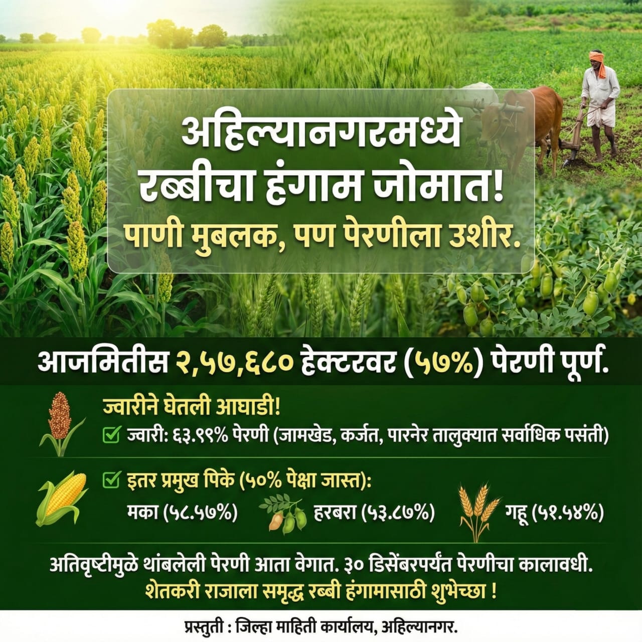 अहिल्यानगर जिल्ह्यात रब्बी पिकांची आजमितीस २,५७,६८० हेक्टरवर ५७% पेरणी पूर्ण झाली आहे.