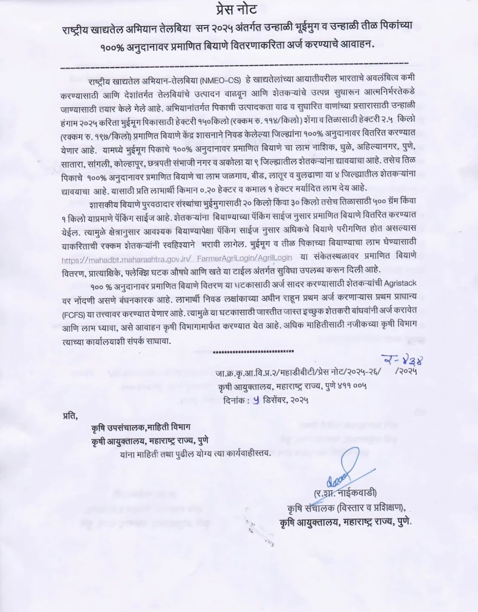 राष्ट्रीय खाद्यतेल अभियान तेलबिया सन २०२५ अंतर्गत उन्हाळी भुईमुग व उन्हाळी तीळ पिकांच्या १००% अनुदानावर प्रमाणित बियाणे वितरणाकरिता अर्ज करण्याचे आवाहन कृषि आयुक्तालया कडून करण्यात आले आहे.