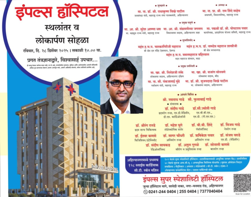 अनेक वर्षांपासून नगरमधील प्रख्यात हृदयरोग तज्ज्ञ अशी ओळख असलेल्या डॉ.संदीप गाडे यांचे इंपल्स हॉस्पिटल आता त्यांच्या मनमाड रस्त्यावरील जुन्या हॉस्पिटलच्याच पाठीमागील बाजूस अत्यंत प्रशस्त अशा वास्तूत स्थलांतरीत होत आहे. हॉस्पिटलचा स्थलांतर आणि लोकार्पण सोहळा उद्या रविवार दि. २८ डिसेंबर २०२५ रोजी सकाळी १० वाजता राज्याचे जलसंपदा मंत्री तथा पालकमंत्री राधाकृष्ण विखे पाटील यांच्या हस्ते होणार असून कार्यक्रमाच्या अध्यक्षस्थानी विधान परिषदेचे सभापती प्रा. राम शिंदे हे असणार आहेत. हॉस्पिटलच्या स्थलांतर आणि लोकर्पण सोहळ्यास सर्वांनी उपस्थित राहण्याचे आवाहन डॉ. संदीप गाडे यांनी पत्रकार परिषदेत केले.