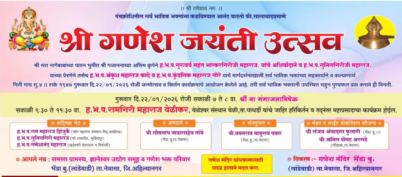 नेवासा तालुक्यातील भेंडा येथील श्री गणेश मंदीर,लांडेवाडी येथे गुरुवार दि.२२  रोजी श्री गणेश जयंती उत्सवाचे आयोजन करण्यात आले आहे.