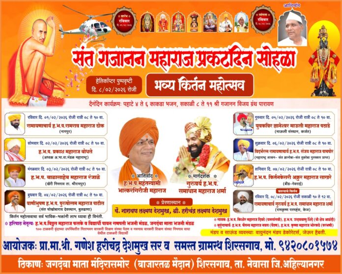 नेवासा तालुक्यातील शिरसगाव येथे संत गजानन (शेगाव) महाराजांच्या प्रकटदिनानिमित्त पहिल्यांदाच भव्य राज्यस्तरीय कीर्तन महोत्सवाचे आयोजन करण्यात आले आहे. या महोत्सवाला रविवार दि.१ फेब्रुवारी २०२6 पासून प्रारंभ होणार असून रविवार दि. ८ फेब्रुवारी २०२६ रोजी काल्याच्या कीर्तनाने सांगता होणार असल्याची माहिती आयोजक प्रा.
