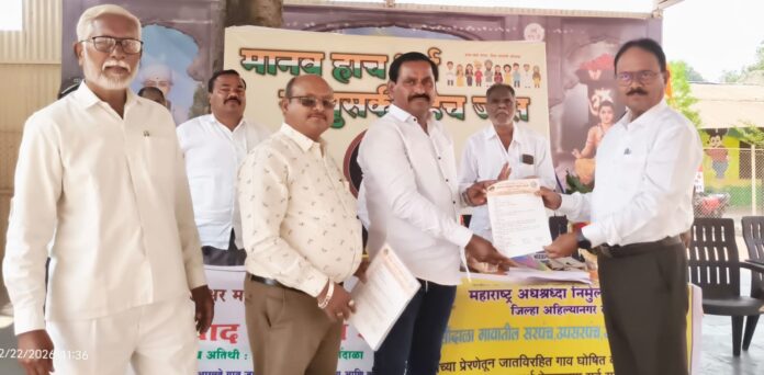 नेवासा तालुक्यातील सौंदाळा येथे झालेल्या कार्यक्रमात महाराष्ट्र अंधश्रध्दा निर्मूलन समिती अहिल्यानगर जिल्हाध्यक्ष बाबासाहेब बुधवंत यांचे हस्ते श्री.खेडकर यांना नियुक्ती पत्र प्रदान करण्यात आले.