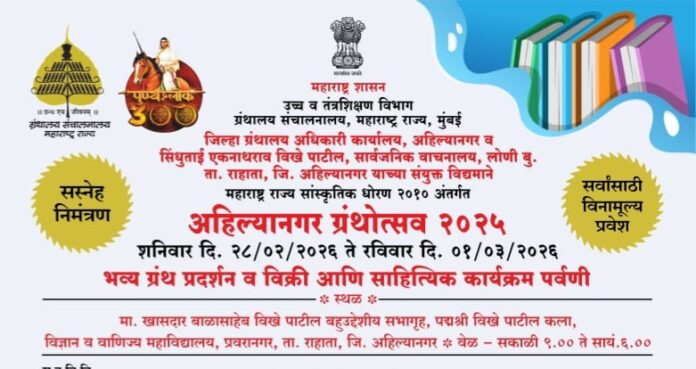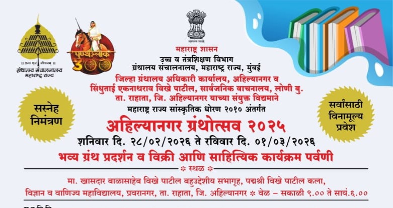 जिल्हा ग्रंथालय अधिकारी कार्यालय, अहिल्यानगर व सिंधुताई एकनाथराव विखे पाटील सार्वजनिक वाचनालय, लोणी बु., ता. राहाता, जि. अहिल्यानगर यांच्या संयुक्त विद्यमाने ‘अहिल्यानगर ग्रंथोत्सव २०२५’ चे आयोजन मा. खासदार बाळासाहेब विखे पाटील बहुउद्देशीय सभागृह, पद्मश्री विखे पाटील कला, विज्ञान व वाणिज्य महाविद्यालय, प्रवरानगर, ता. राहाता येथे शनिवार, दि. २८ फेब्रुवारी २०२६ व रविवार, दि. १ मार्च २०२६ रोजी करण्यात आले असल्याची माहिती अहिल्यानगर जिल्हा ग्रंथालय अधिकारी रामदास शिंदे यांनी दिली आहे.