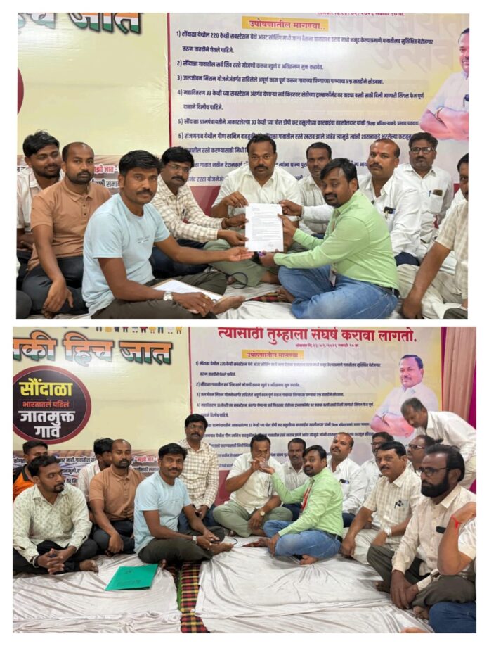 सौंदाळा येथील २२० केव्ही सबटेशन येथे आउट सोर्सिंगमध्ये जागा देतांना ग्रामसभा ठरावमध्ये नमूद केल्याप्रमाणे गावातीलच सुशिक्षित बेरोजगार तरुण तातडीने घेतले पाहिजे, सौंदाळा गावातील सर्व शिव रस्ते मोजणी करून खुले व अतिक्रमण मुक्त करावेत, जलजीवन मिशन योजनेअंतर्गत राहिलेले अपूर्ण काम पूर्ण करून गावाच्या पिण्याच्या पाण्याचा प्रश्न सोडवावा, महावितरण ३३ केव्ही च्या सबटेशन अंतर्गत येणाऱ्या सर्व फिडरवर शेतीच्या ट्रान्सफार्मर वर वाड्या वस्ती साठी दिली जाणारी सिंगल फेज पूर्ण दाबाने द्यावी,सौंदाळा ग्रामपंचायतीने आकारलेल्या ३३ केव्ही च्या पोल डीपी कर वसुलीच्या कारवाईचा तहसीलदार यांनी आपलेकडे प्रस्थाव पाठवावा, रांजणगाव येथील गौण खनिज वाहतुकीमुळे सौंदाळा गावातील रस्ते खराब झाले आहेत त्यामुळे त्यांनी शासनाकडे भरलेल्या करातून सौंदाळा गावातील रस्ते करण्यासाठी निधी मिळावा,सौंदाळा गावात नवीन रेशनकार्ड ऑनलाइन करणे व त्यांना धान्य पुरवठा करण्यासाठी तातडीने कॅम्प आयोजित करावा,पानंद रस्ता योजनेअंतर्गत सौंदाळा येथील पानंद रस्ता करण्यासाठी तातडीने १० लाख रु निधी मिळावा या मागण्यासाठी
