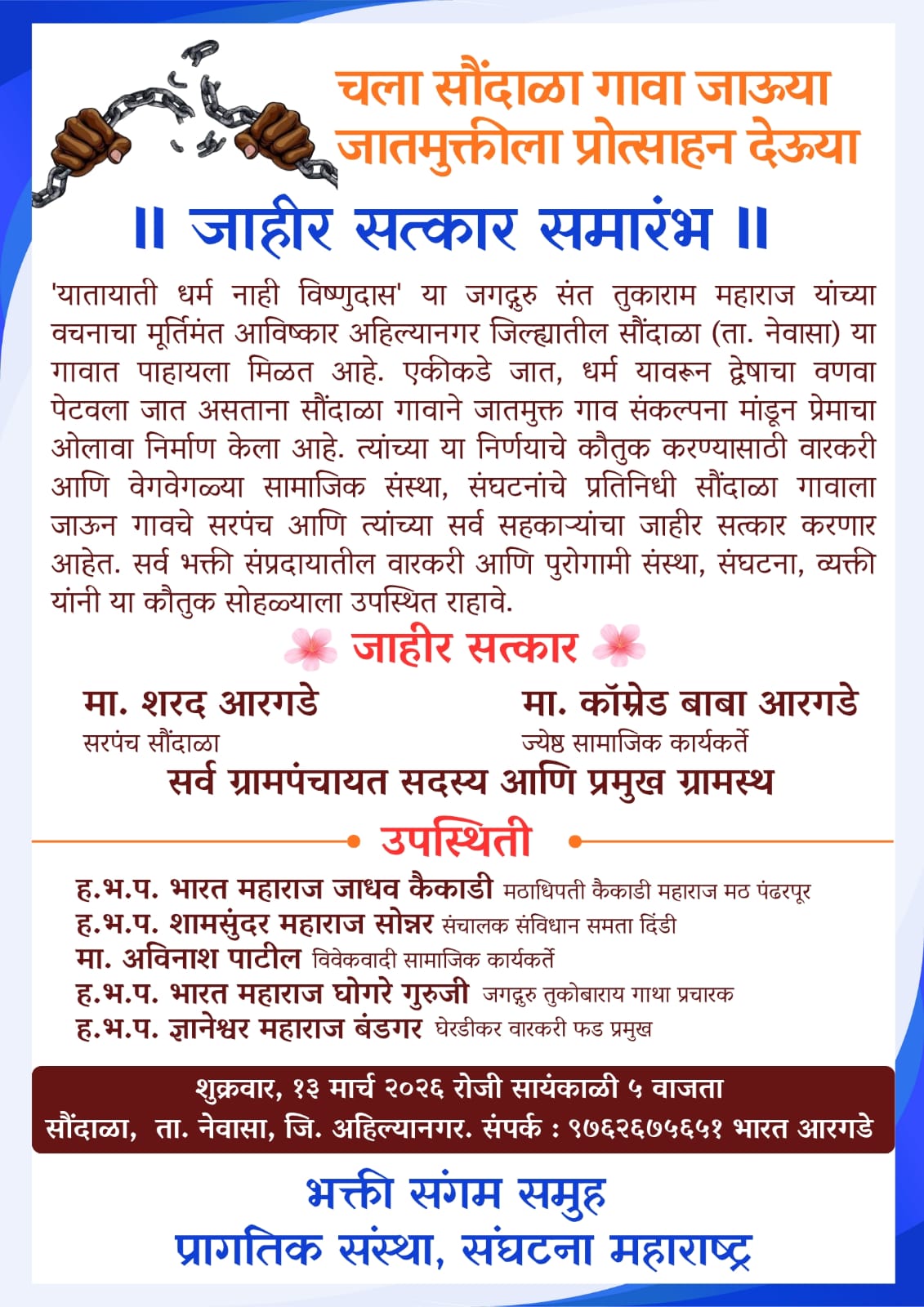 एकीकडे जात, धर्म यावरून द्वेषाचा वनवा पेटवला जात असताना सौंदाळा (ता. नेवासा) गावाने जातमुक्त गाव संकल्पना मांडून प्रेमाचा ओलावा निर्माण केला आहे. ही अत्यंत मोलाची गोष्ट आहे. सौंदाळा गावाचा हा निर्णय अत्यंत कौतुकास्पद आहे. त्यामुळे हे गाव, गावचे नेतृत्व आणि गावचे नागरिक हे कौतुकास पात्र आहेत. त्यांच्या या निर्णयाबद्दल गावचे सरपंच आणि सहकाऱ्यांचा आज शुक्रवार दि.१३ मार्च २०२६ रोजी सायंकाळी ५ वाजता सौंदाळा येथे जाहीर सत्कार करणार आहोत, अशी माहिती भक्ती संगम समुहाचे संचालक ह.भ.प. श्यामसुंदर महाराज सोन्नर यांनी दिली.