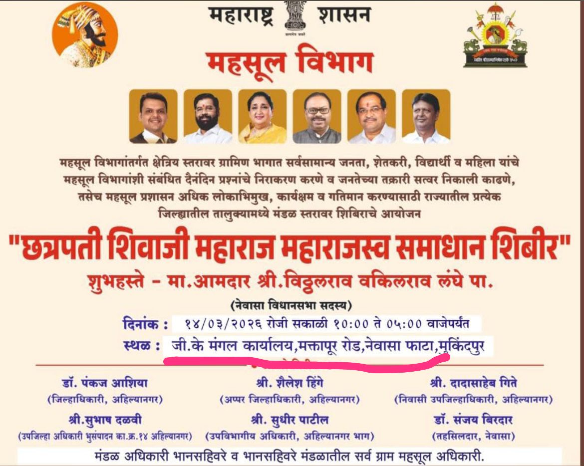 महसूल प्रशासन अधिक लोकाभिमुख, कार्यक्षम व गतिमान करण्यासाठी तालुक्यामध्ये मंडळ स्तरावर होणारे “छत्रपती शिवाजी महाराज महाराजस्व समाधान शिबीराचे आयोजन भानसहिवरे मंडलाचे वतीने आज शनिवार दि. १४ रोजी स.१० ते सांय.५ यावेळेत नेवासा फाटा येथे करण्यात आलेची माहिती तहसीलदार संजय बिरादार व भानसहिवरे मंडलाधिकारी सरिता मुंडे यांनी दिली आहे.
