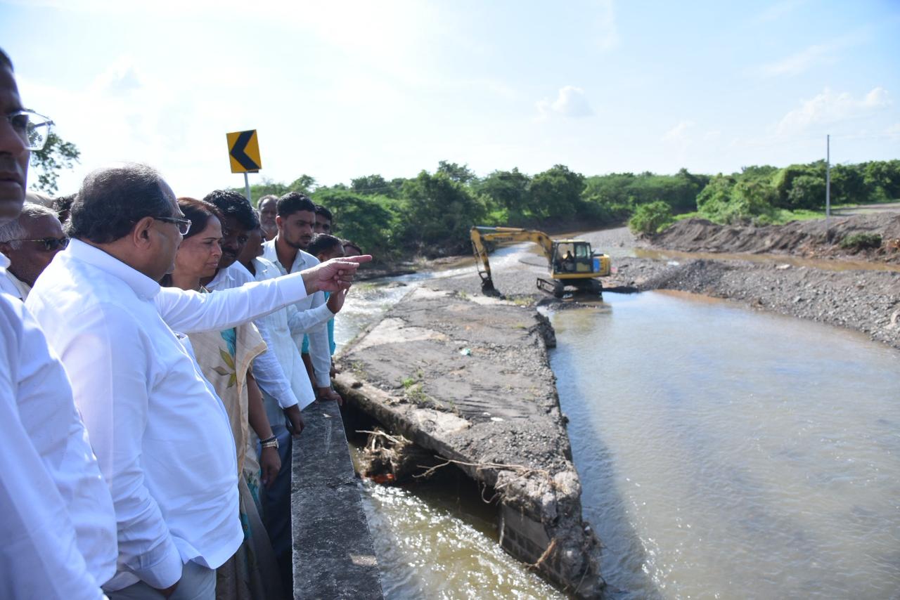 अतिवृष्टीमुळे पाथर्डी व शेवगाव तालुक्यातील शेतपीक, शेतजमीन तसेच इतर नुकसानीची पालकमंत्री डॉ. विखे पाटील यांनी सलग दुसऱ्या दिवशी प्रत्यक्ष पाहणी केली. यावेळी आमदार मोनिका राजळे, जिल्हाधिकारी डॉ. पंकज आशिया, जिल्हा परिषदेचे मुख्य कार्यकारी अधिकारी आनंद भंडारी, उपविभागीय अधिकारी प्रसाद मते, तहसीलदार उद्धव नाईक, जिल्हा अधीक्षक कृषी अधिकारी सुधाकर बोराळे, जिल्हा जलसंधारण अधिकारी पी. बी. गायसमुद्रे आदी उपस्थित होते.